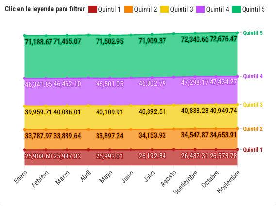En noviembre del año pasado el quintil de menos ingresos se ubicaba en 25,458.00 pesos, pasando al mismo mes de este año a 26,573.78 pesos, para un incremento del 4.38 % en un año.
