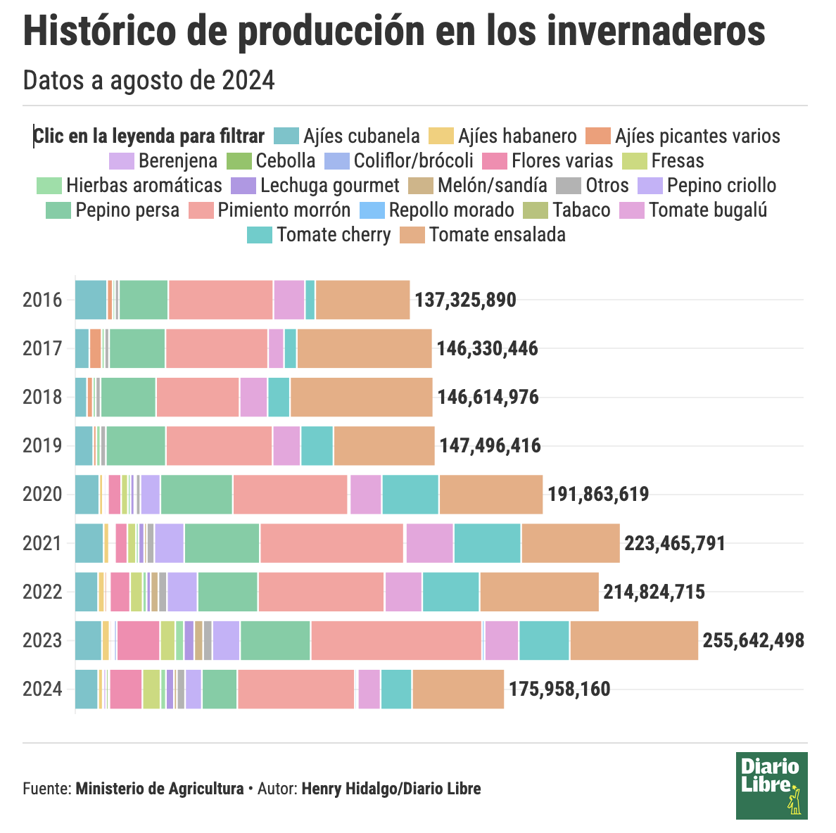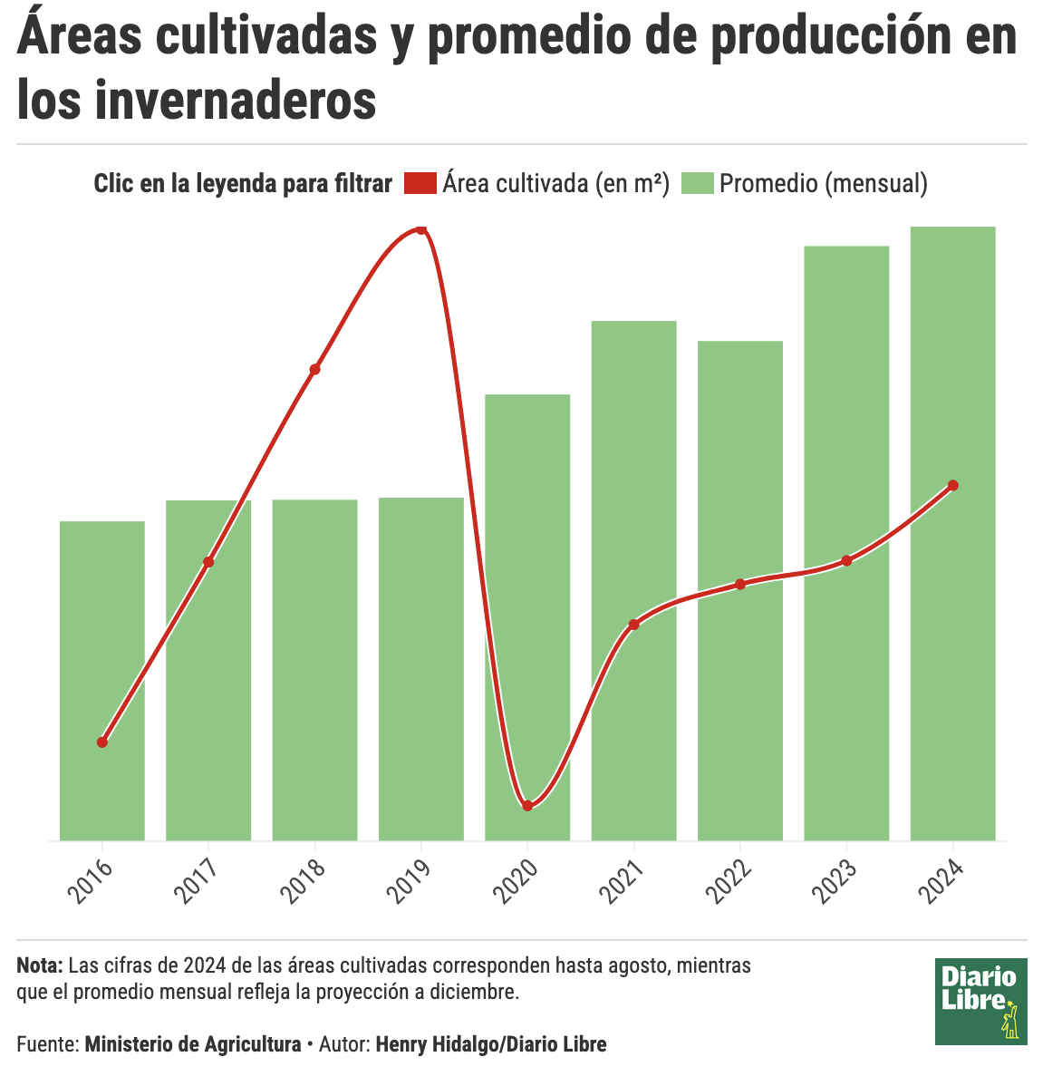 Hasta agosto del 2024, el país había registrado 175,958,161 libras de vegetales producidos en invernaderos, según Rosario Pérez, por lo que si el promedio mensual estimado es de 22 millones, el año cerró en alrededor de 264 millones de libras. Esto representa un aumento en comparación con las 255,642,498 del 2023, cuando el promedio mensual alcanzó las 21,303,541 libras, en una superficie de 10,169,045 metros cuadrados.
