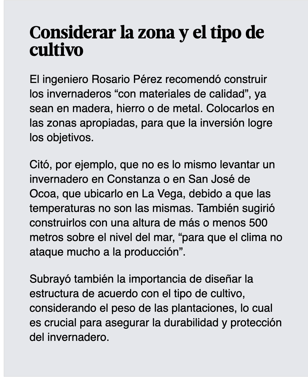 De acuerdo con Rosario Pérez, la gestión de Abinader ha apoyado a los productores de invernaderos en situaciones de condiciones atmosféricas, como tornados y ciclones, entre otros.