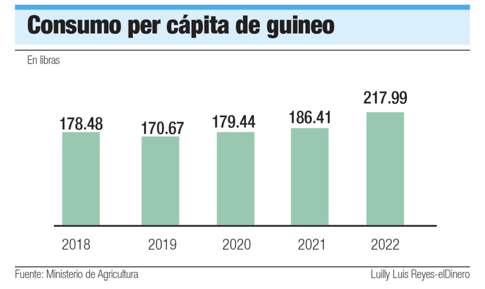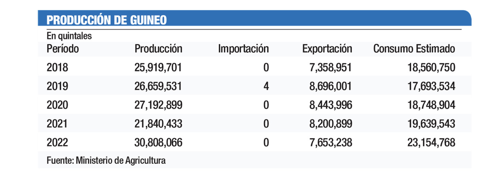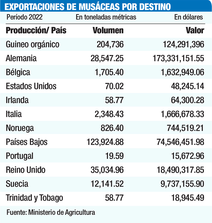 No obstante, según el Ministerio de Agricultura, las exportaciones de banano tradicional (guineo) en 2022 totalizaron US$109.3 millones, una variación de 69.9% respecto a 2018, cuando se ubicó en US$64.3 millones. Conforme con los datos, se vendieron al mercado extranjero 538,925 toneladas métricas en ese lustro.
