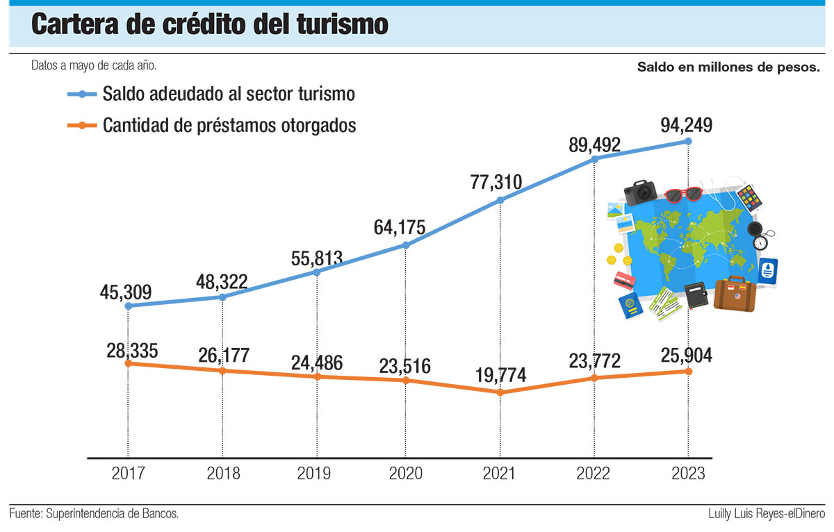 El Banco Central (BC) lo afirma: RD$5,276.2 millones los ingresos fiscales relacionados con la industria de viajes y turismo entre enero-abril 2023. Los recursos que destina la banca local a la llamada industria sin chimenea aumentaron un 5.3%, al pasar de RD$89,492 millones a mayo 2022 a RD$94,249 millones en igual mes del 2023. Esto significa RD$4,757 millones desembolsados a través de 2,132 nuevos préstamos, registra la Superintendencia de Bancos (SB).