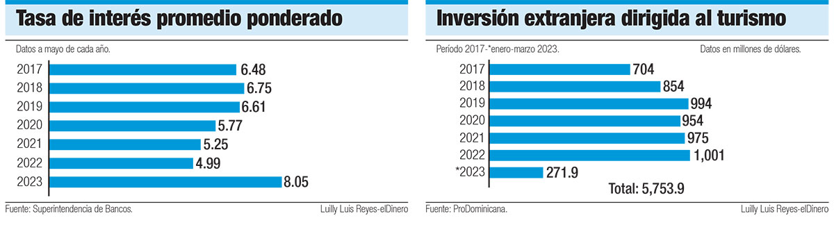 En el primer trimestre del 2023, el Centro de Exportación e Inversión de República Dominicana (ProDominicana) cuenta una inversión de US$271.9 millones dirigida al turismo. Al analizar desde el 2017 hasta el 2022, se evidencia un monto total de US$5,482 millones de capital foráneo destinado al turismo, siendo el 2022 el año que captó la mayor inversión, al reportar US$1,001 millones, seguido del 2019 con US$994 millones y 2021 unos US$975 millones. En tanto, 2017 se fijó en US$704 millones; 2018, US$854 millones y 2020, US$954 millones.n