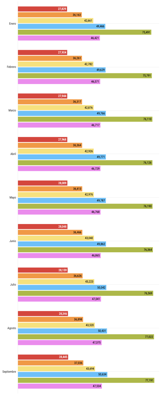 Por quintiles, el costo de la canasta también muestra incrementos proporcionales. En el quintil 1 (los hogares de menores ingresos), el costo subió de 27,828.58 en enero a 28,445.17 en septiembre, un 2.2 % más, mientras que en el quintil 5 (mayores ingresos) pasó de 75,490.79 pesos a 77,191.37 pesos, un aumento de 1,700.58 pesos en nueve meses. El quintil cinco fue el que más subió, equivalente a un 2.3 %.