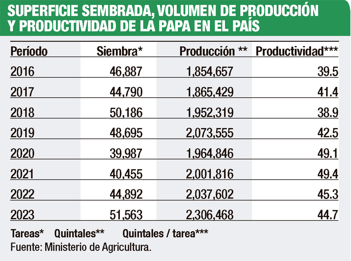 De acuerdo con datos del Ministerio de Agricultura, entre 2016 y 2019 se sembraron 190,558 tareas de papa y se produjeron 7,735,960 quintales, mientras que durante el período 2020-2023 se produjeron 8,310,732 quintales en 176,898 tareas. Esto significa que en promedio República Dominicana pasó de producir 1,993,990 quintales a 2,077,683 quintales papas por año, unos 83,673 quintales más y en menos terreno, pasando de 47,224.5 tareas en promedio a 44,639.5 tareas por año. Esto quiere decir que se logró un aumento en la productividad de 4.2% promedio anual al comparar ambos períodos.